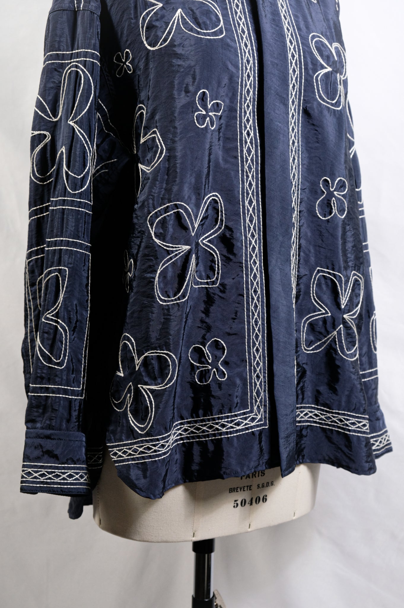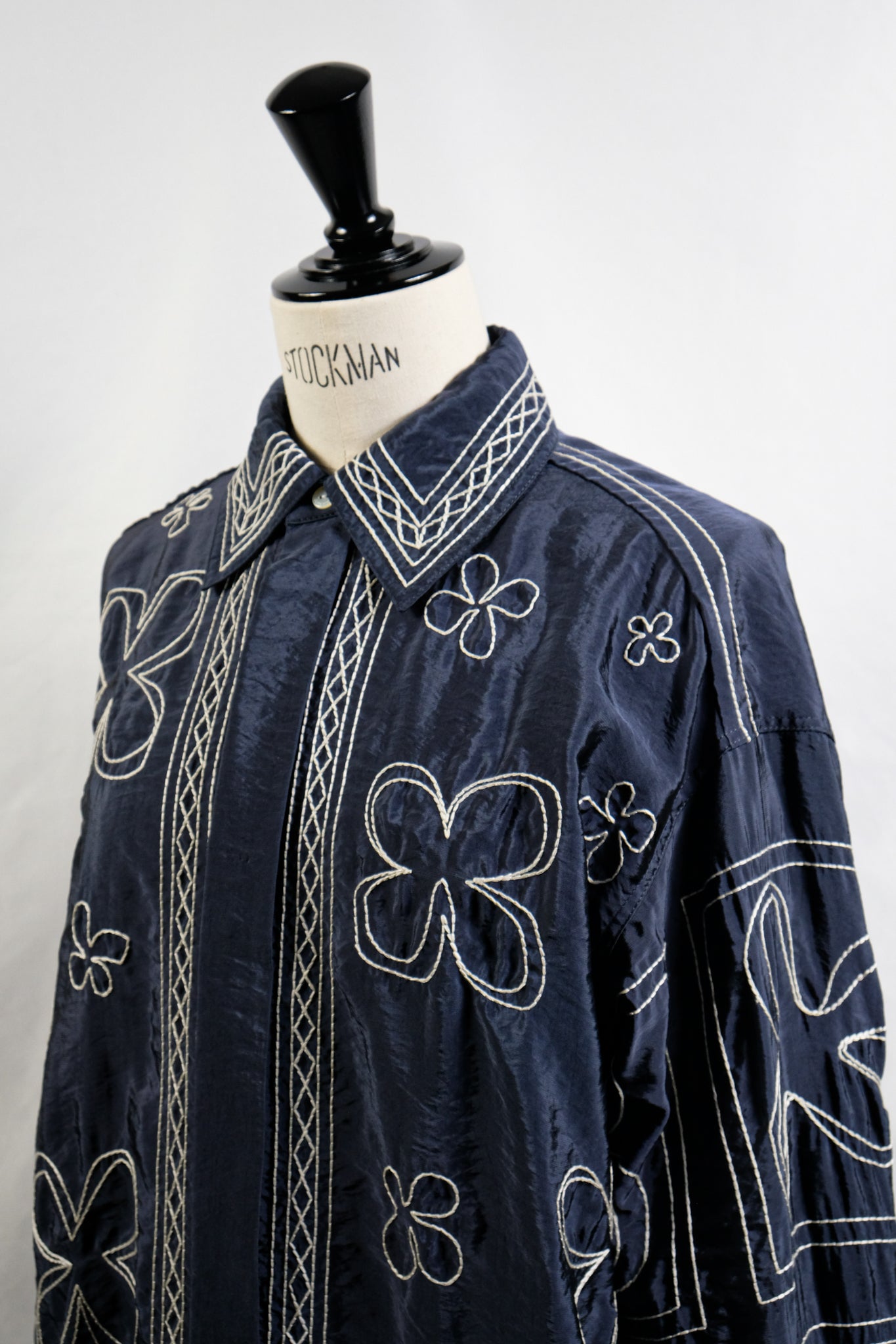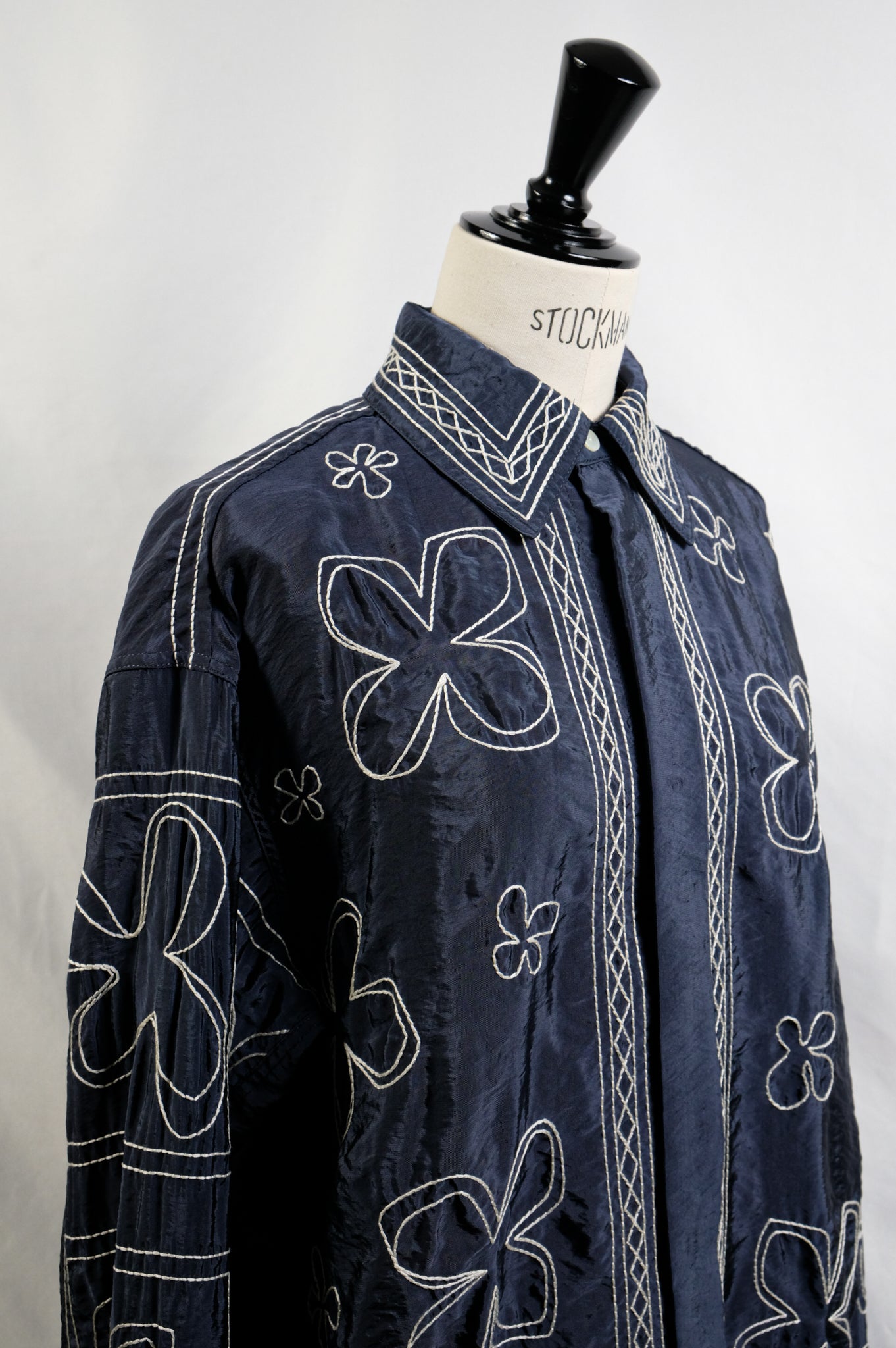 ハンドステッチ風のタッチにするために糸を撚り合わせ、大きめのストロークで刺繍することで、ザックリとしたハンドエンブロイダリーのようなムードに仕上げています。 襟やフロントのパネル刺繍が効いており、袖と身頃の柄も敢えて変えています。