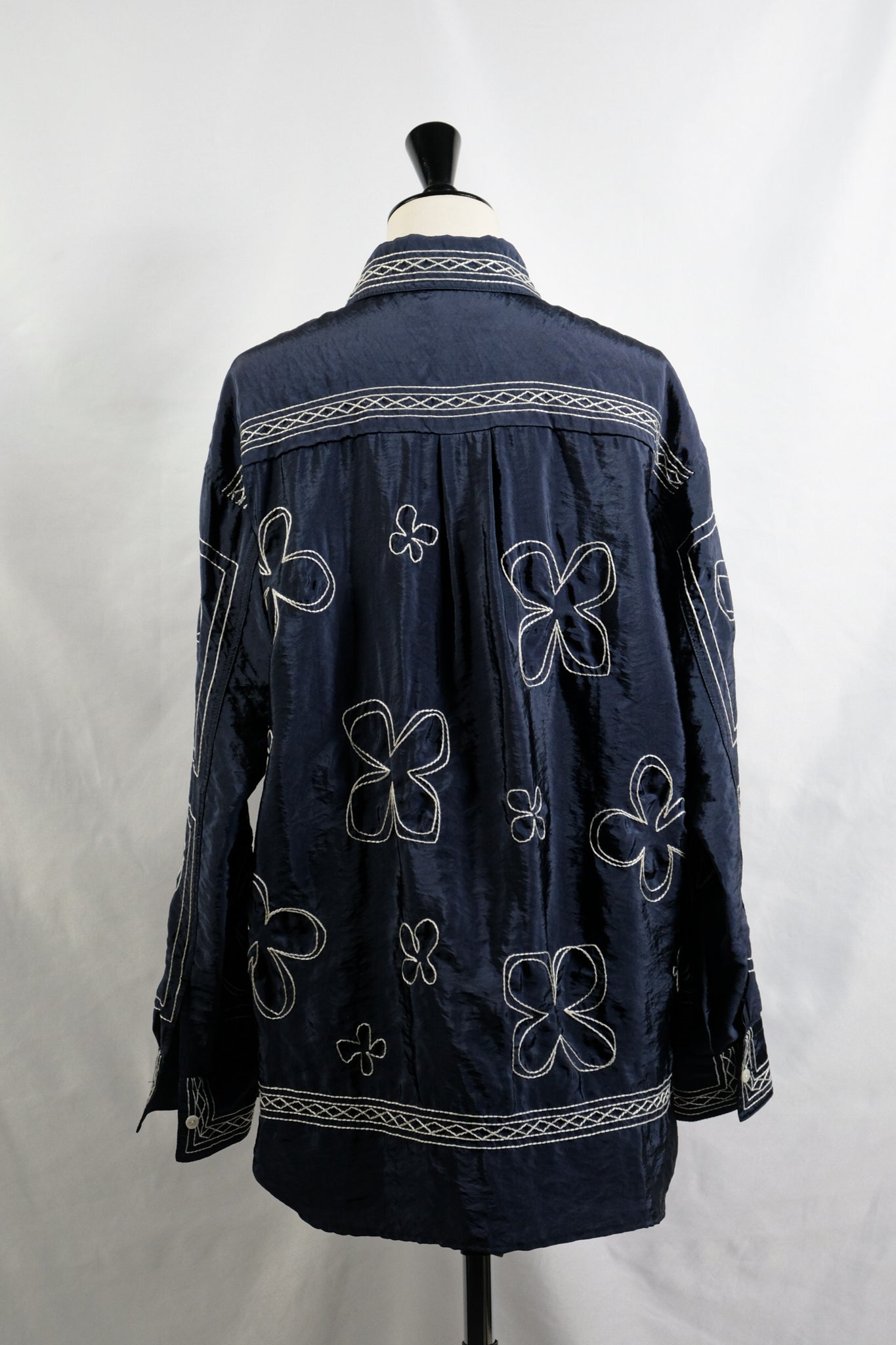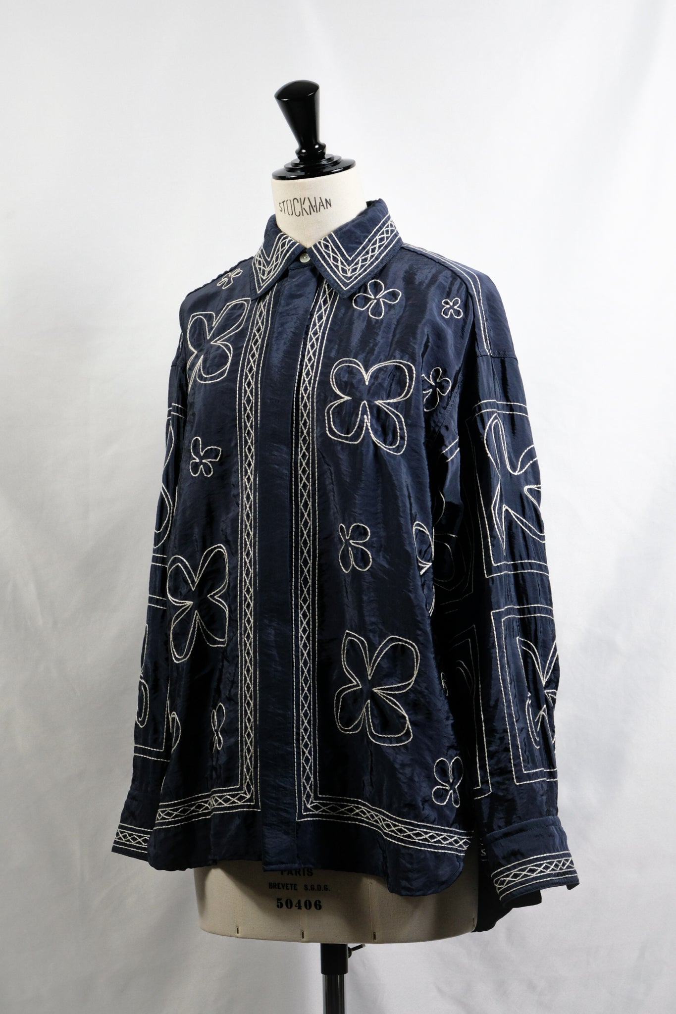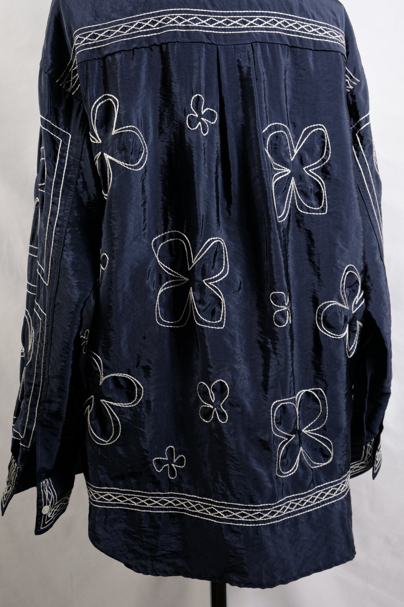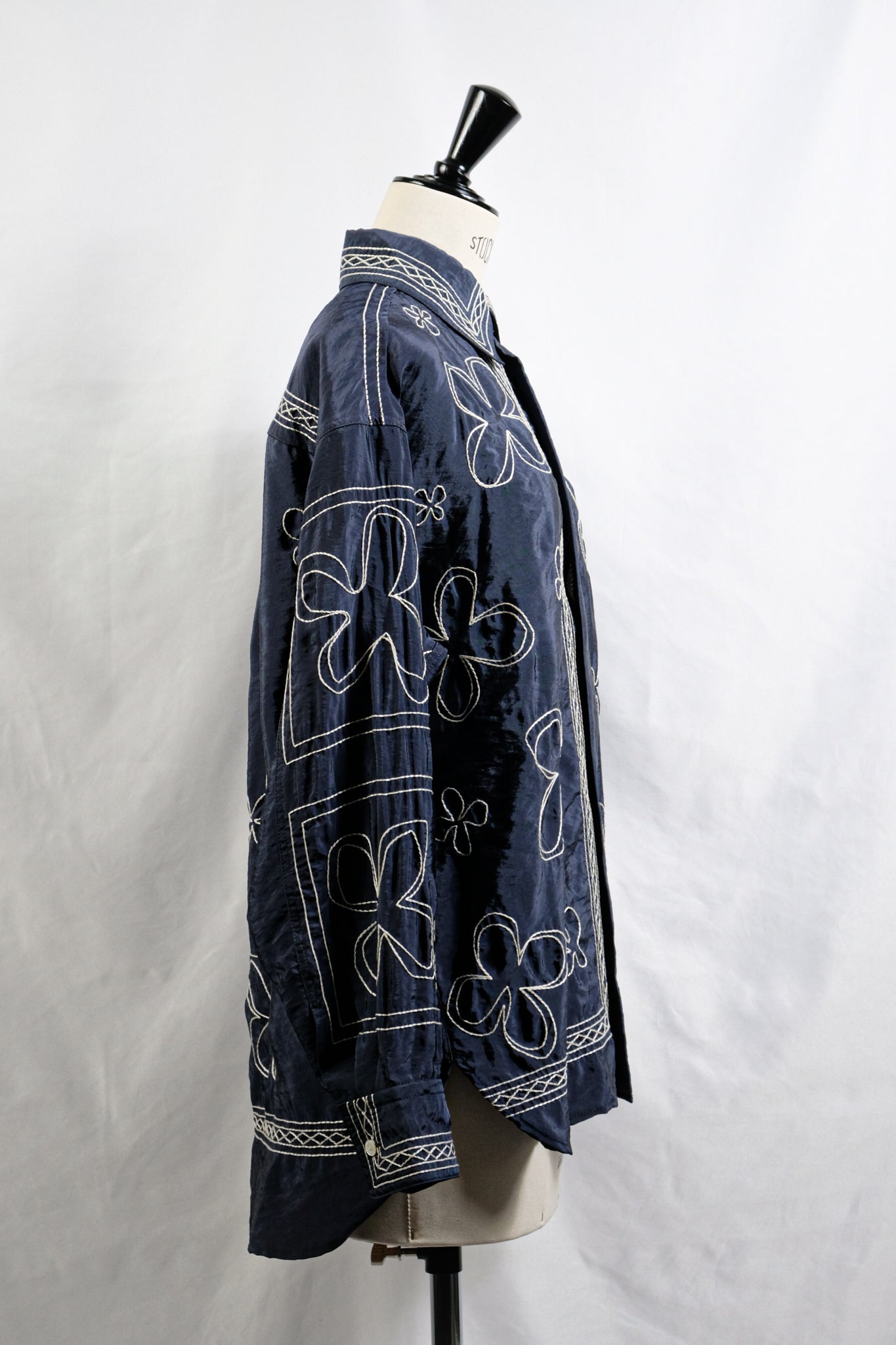 ハンドステッチ風のタッチにするために糸を撚り合わせ、大きめのストロークで刺繍することで、ザックリとしたハンドエンブロイダリーのようなムードに仕上げています。 襟やフロントのパネル刺繍が効いており、袖と身頃の柄も敢えて変えています。