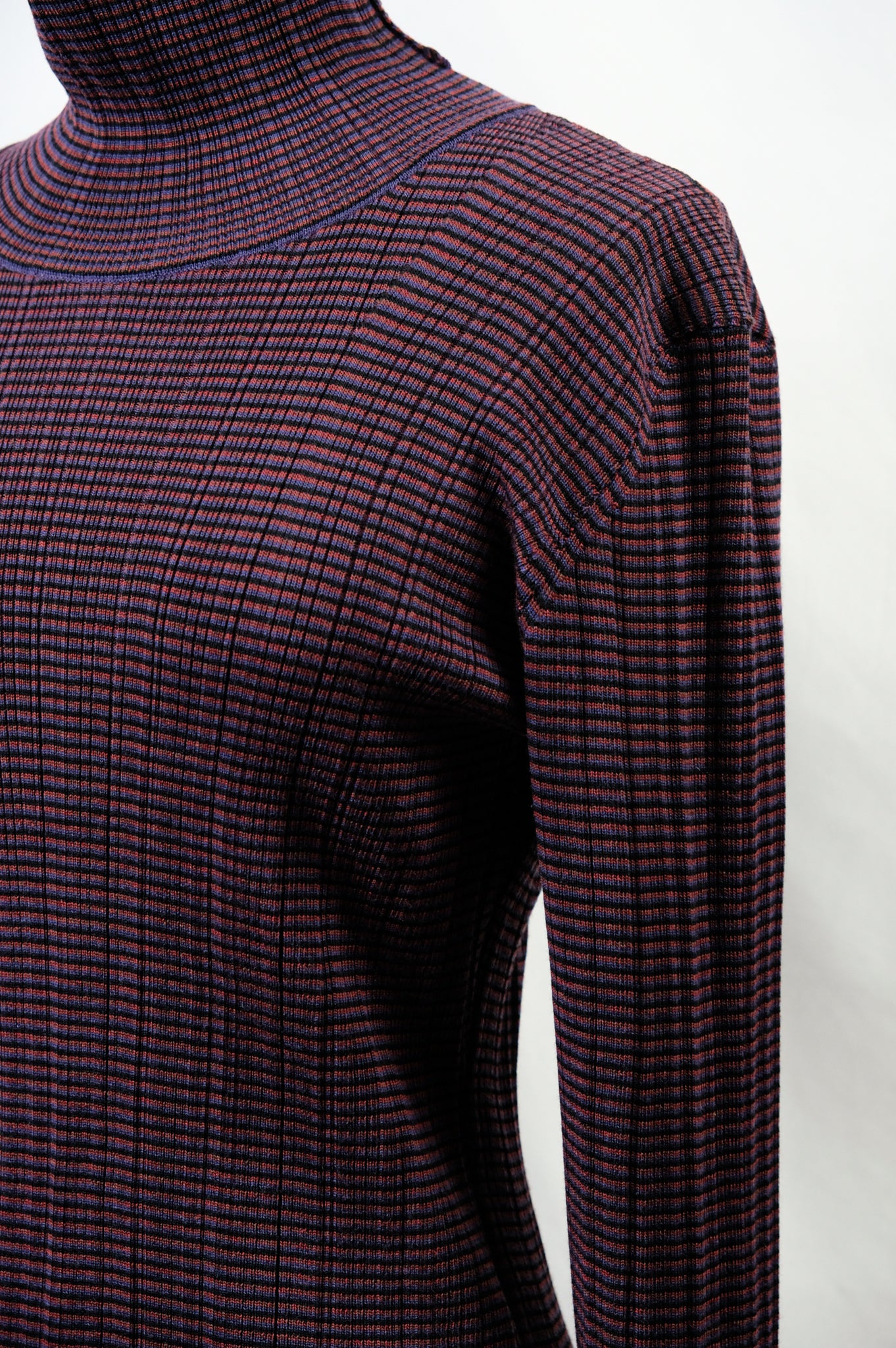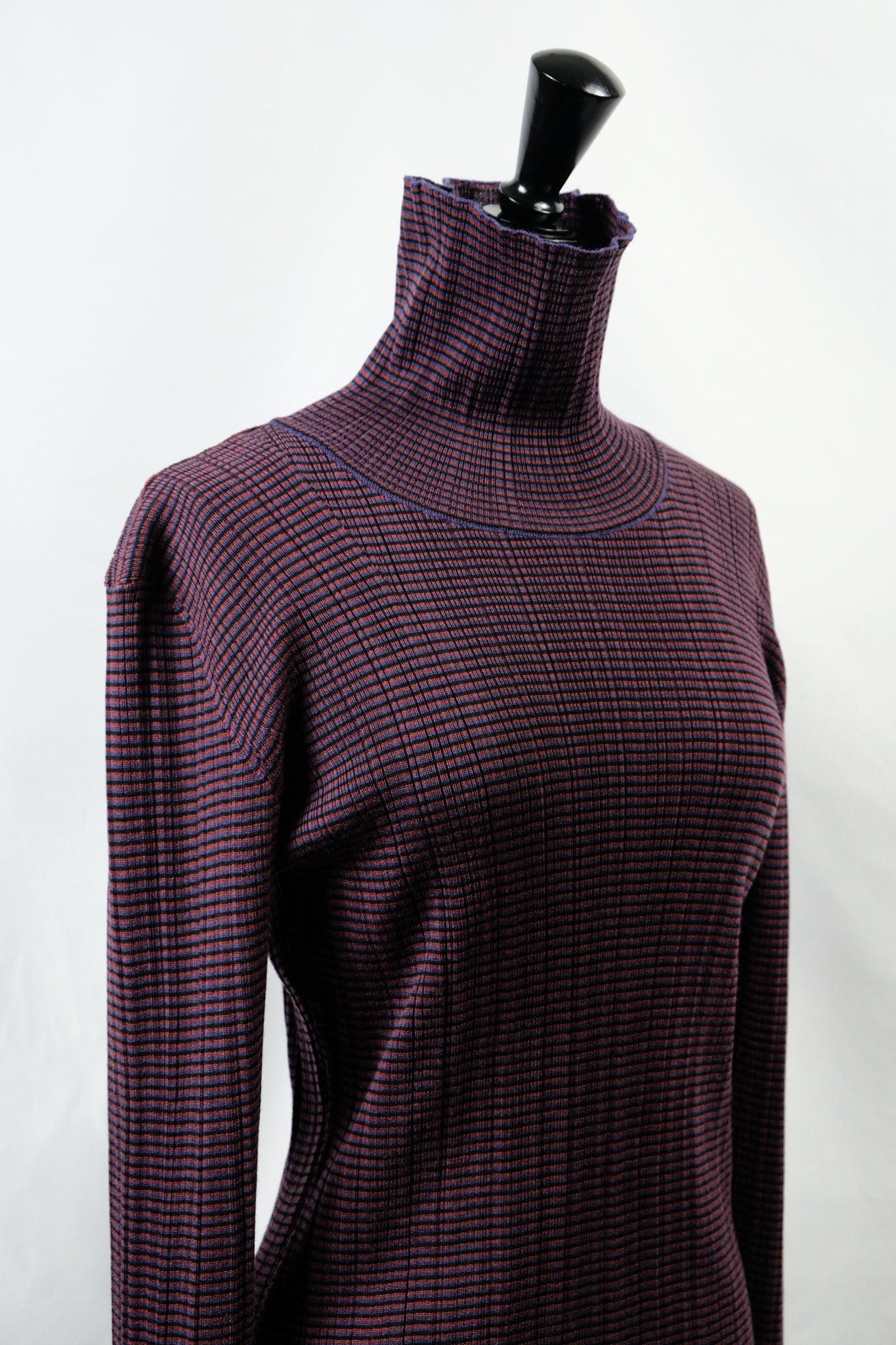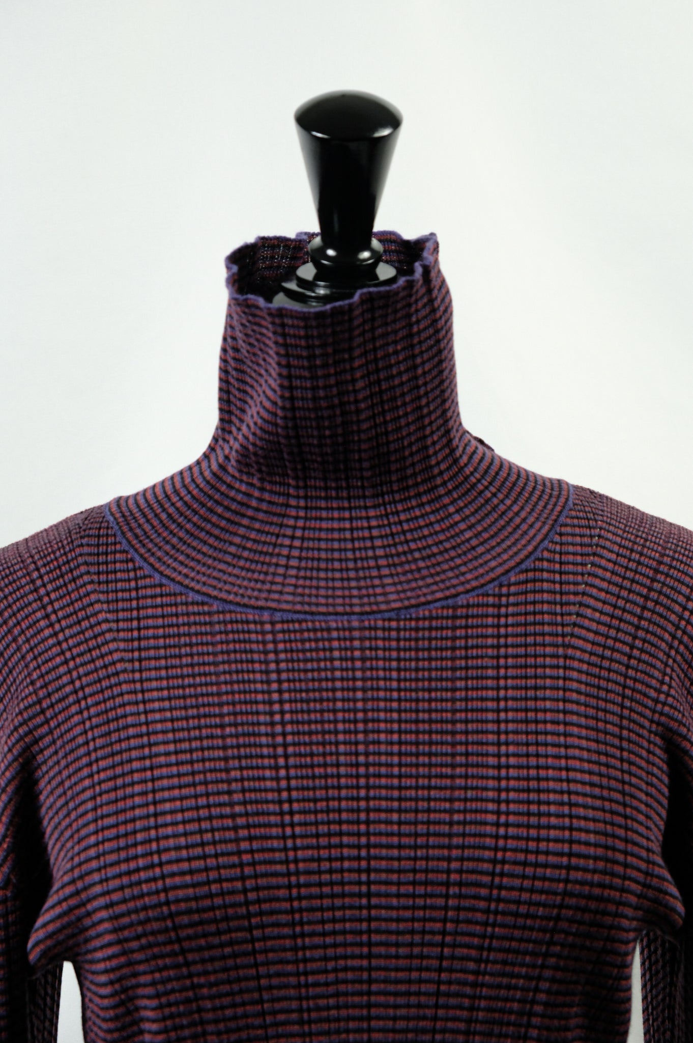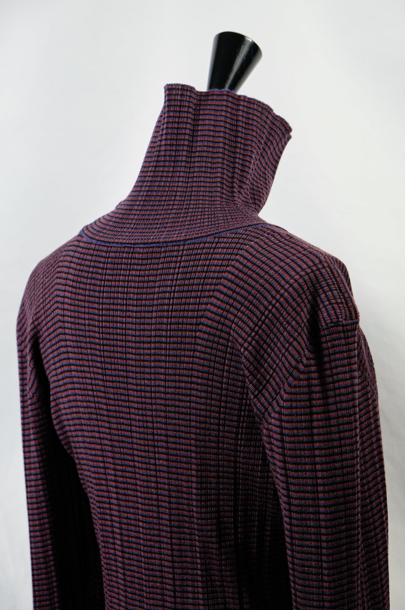 A high-neck sweater with a fine border and random rib pattern.