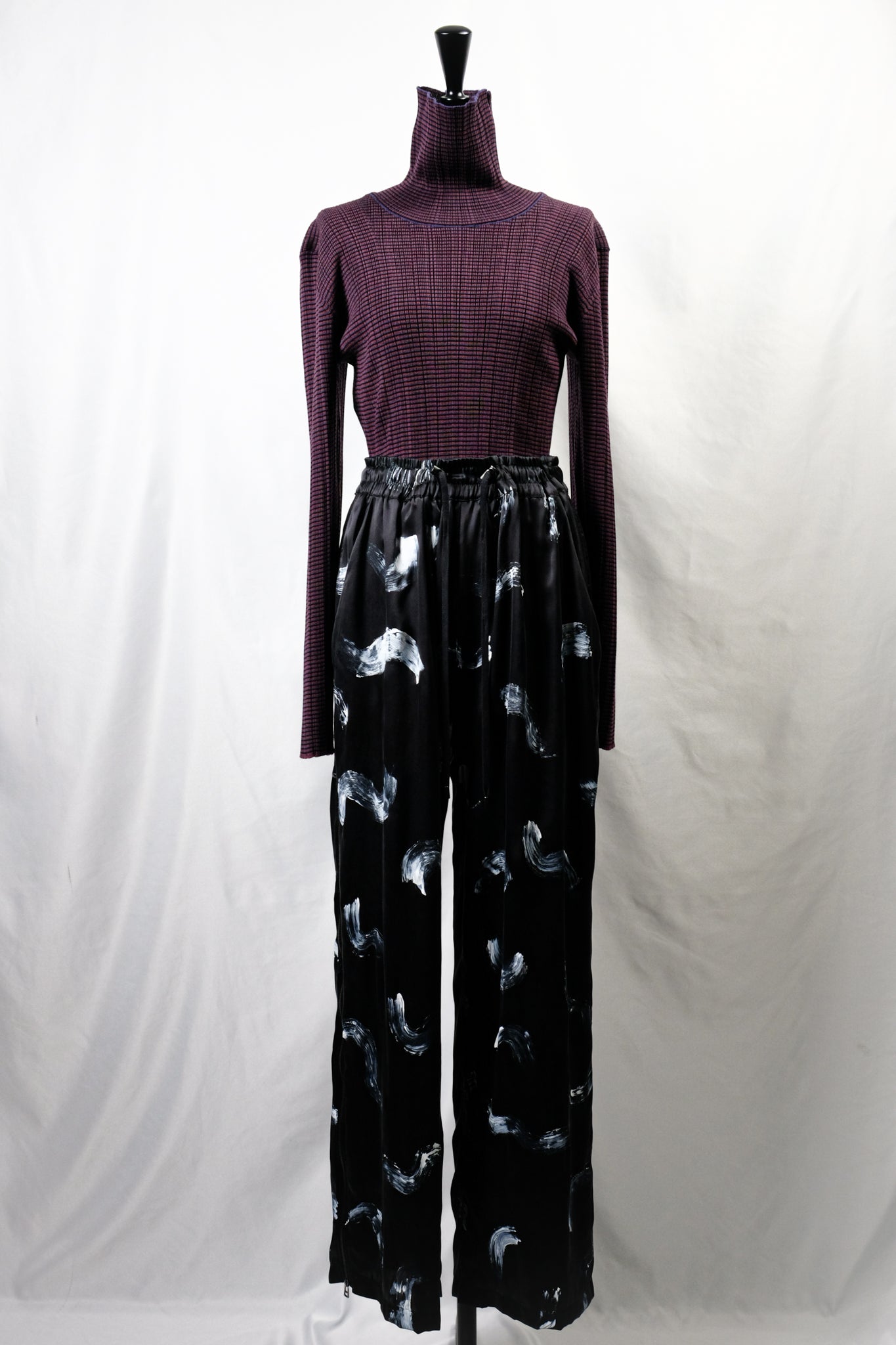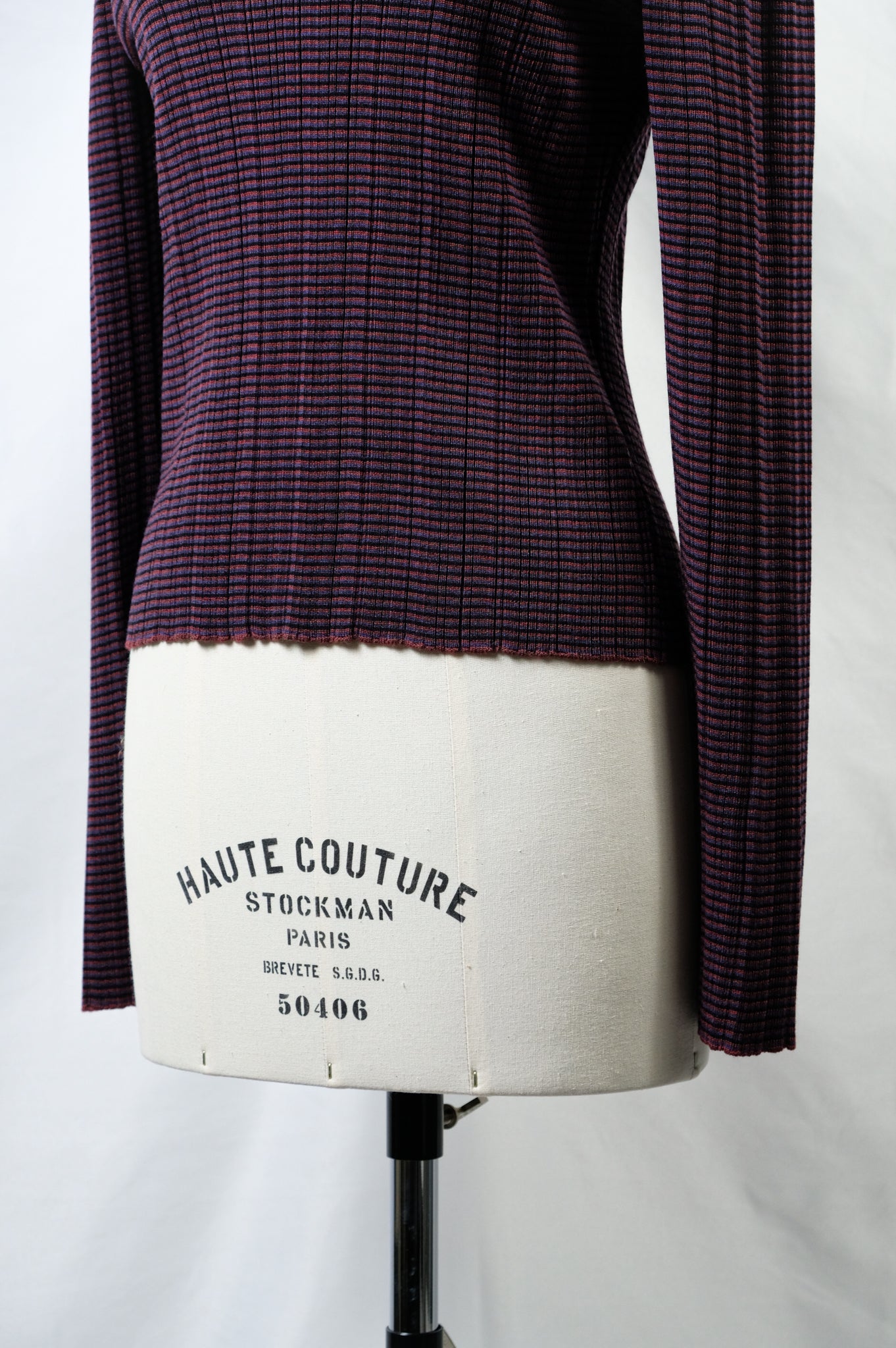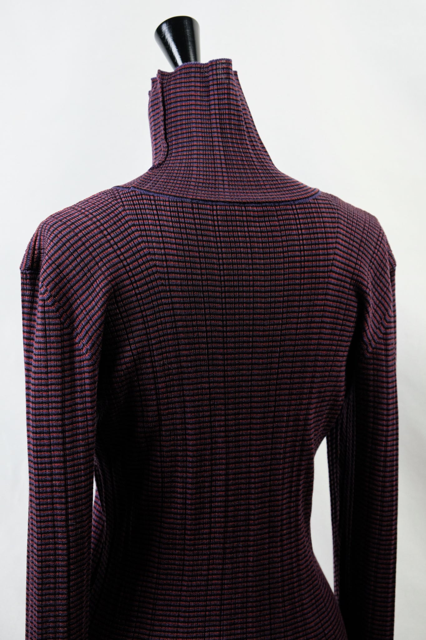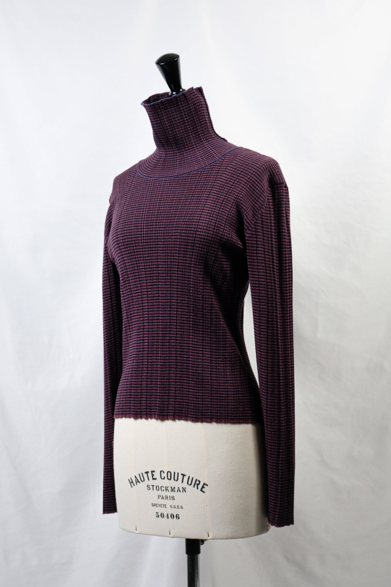 A high-neck sweater with a fine border and random rib pattern.