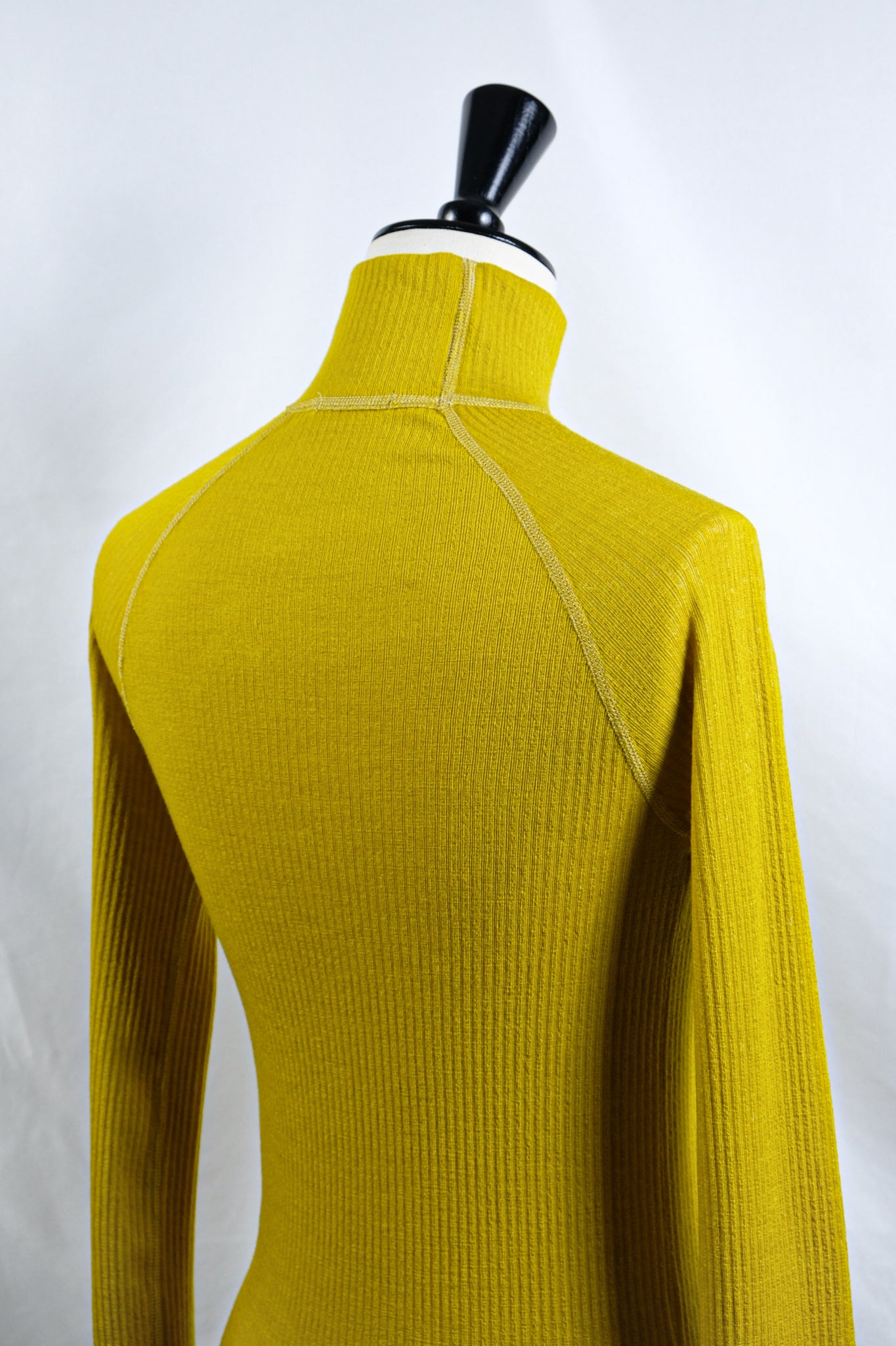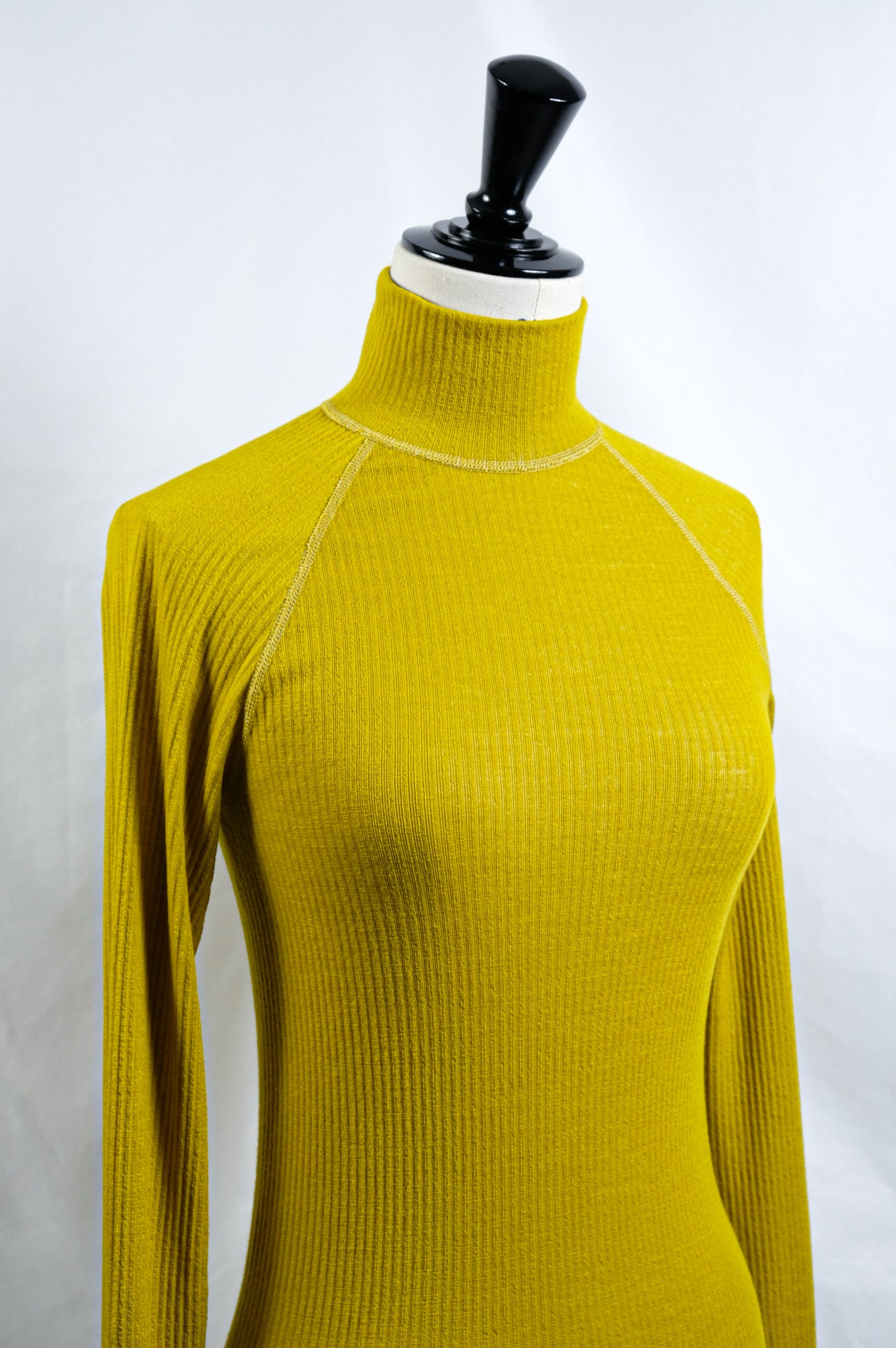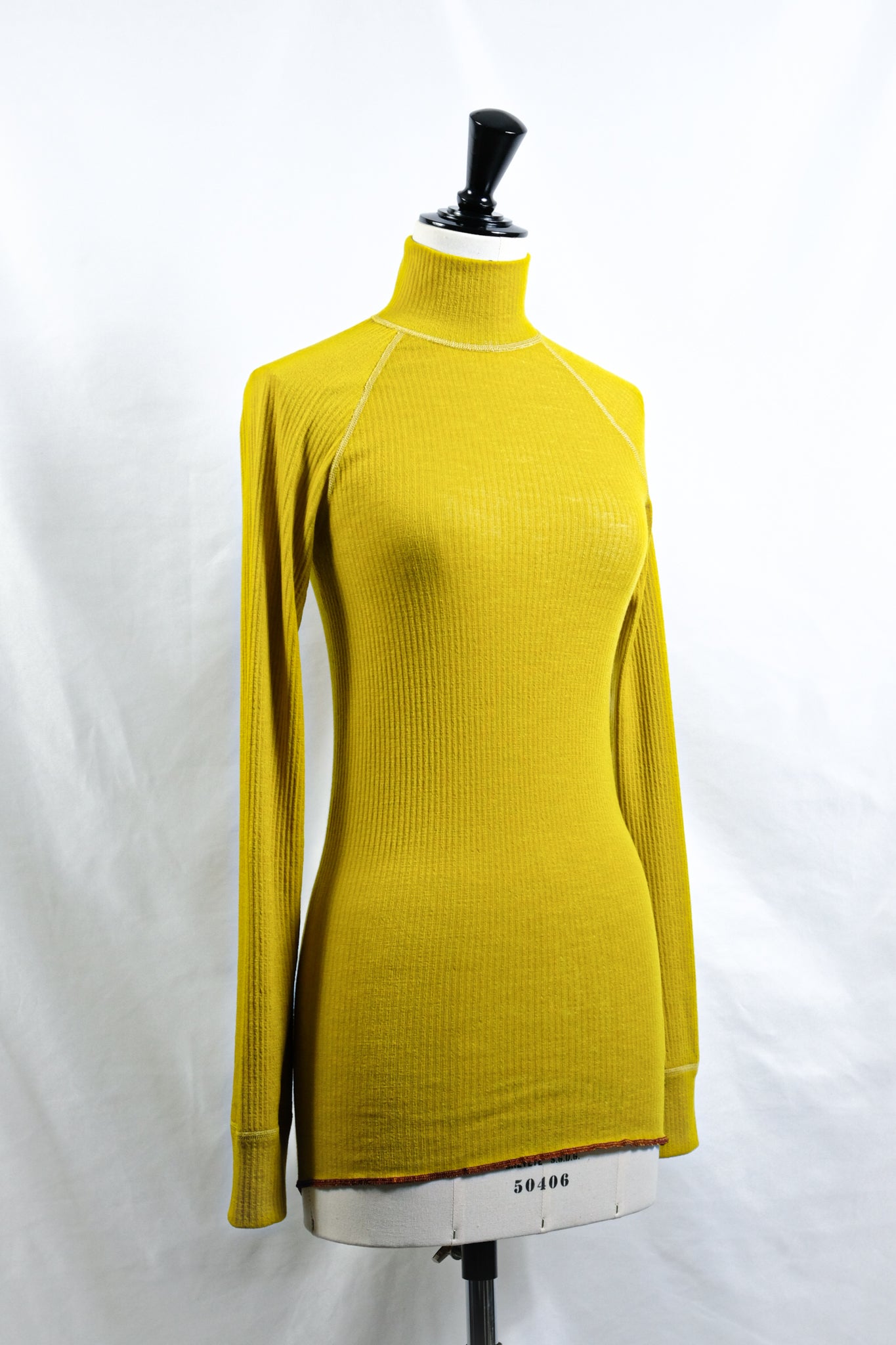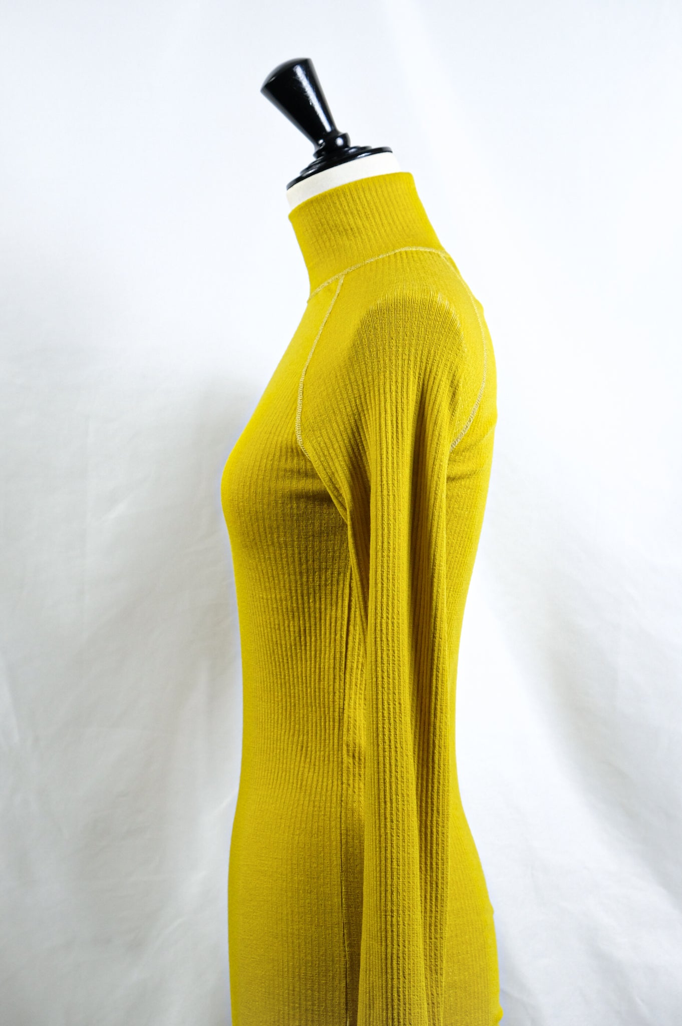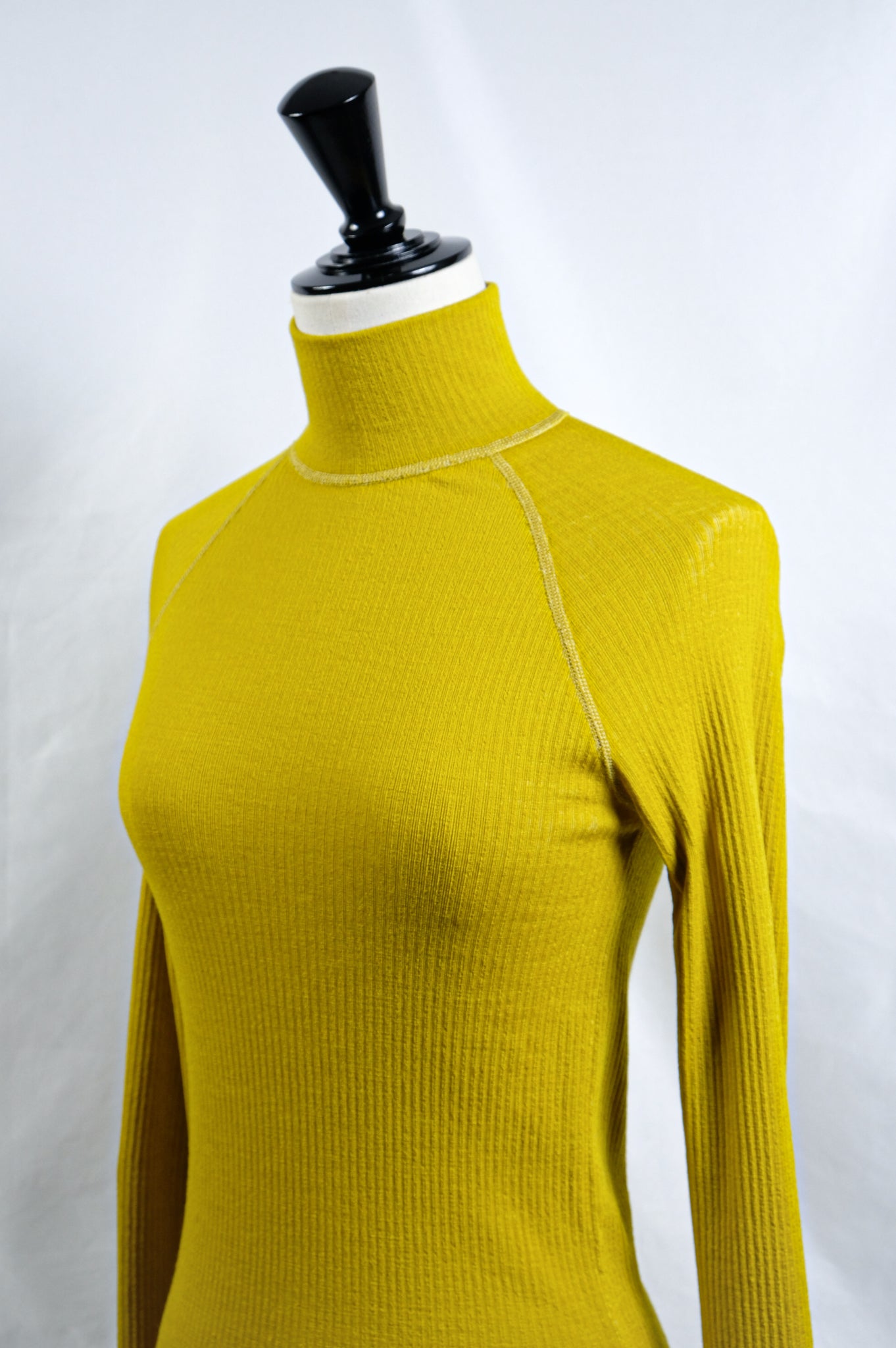 A turtleneck top made of needle rib jersey, which has a distinctive deep look.