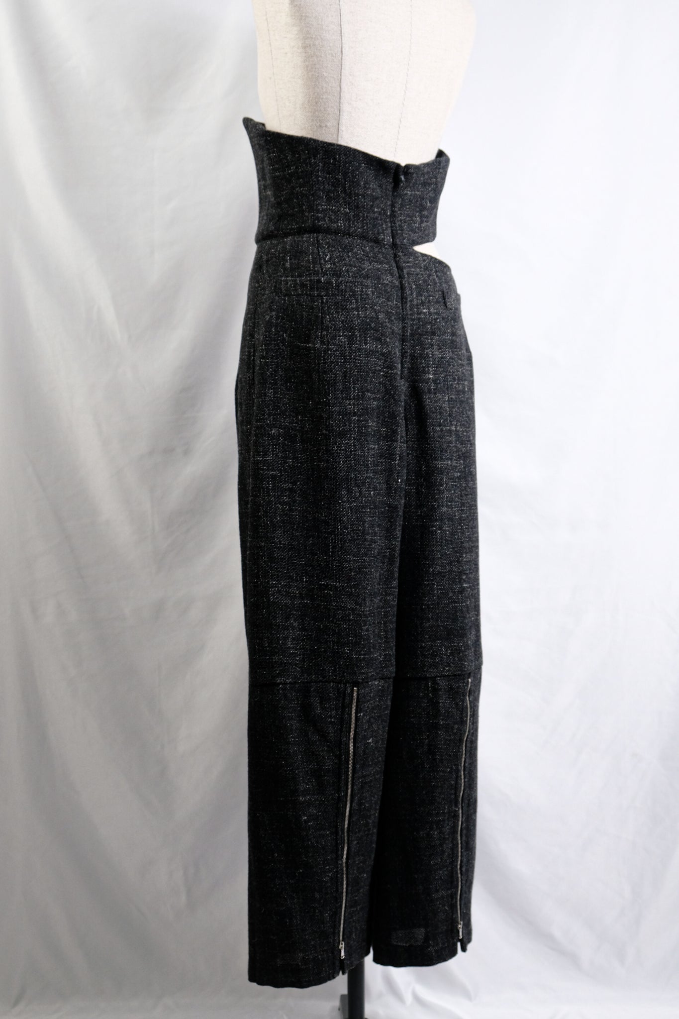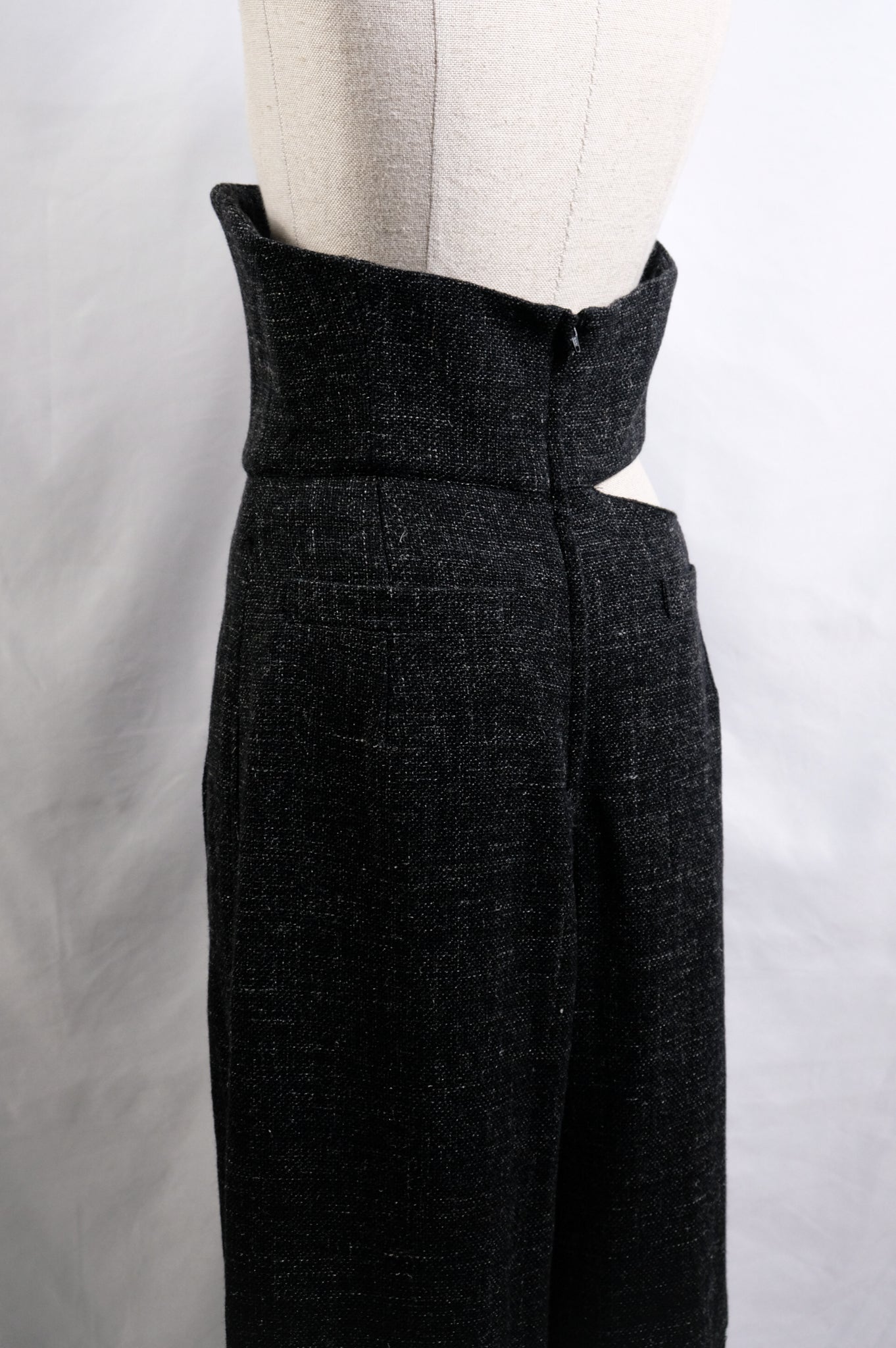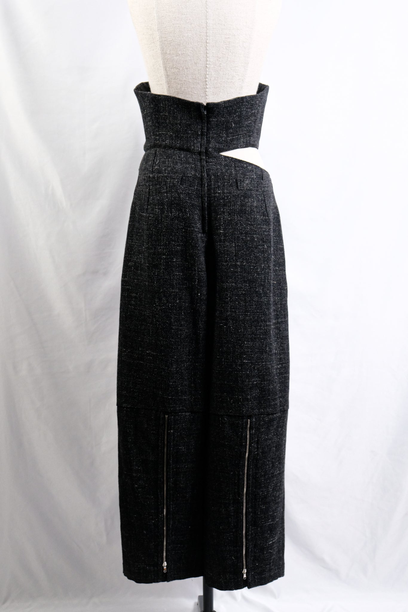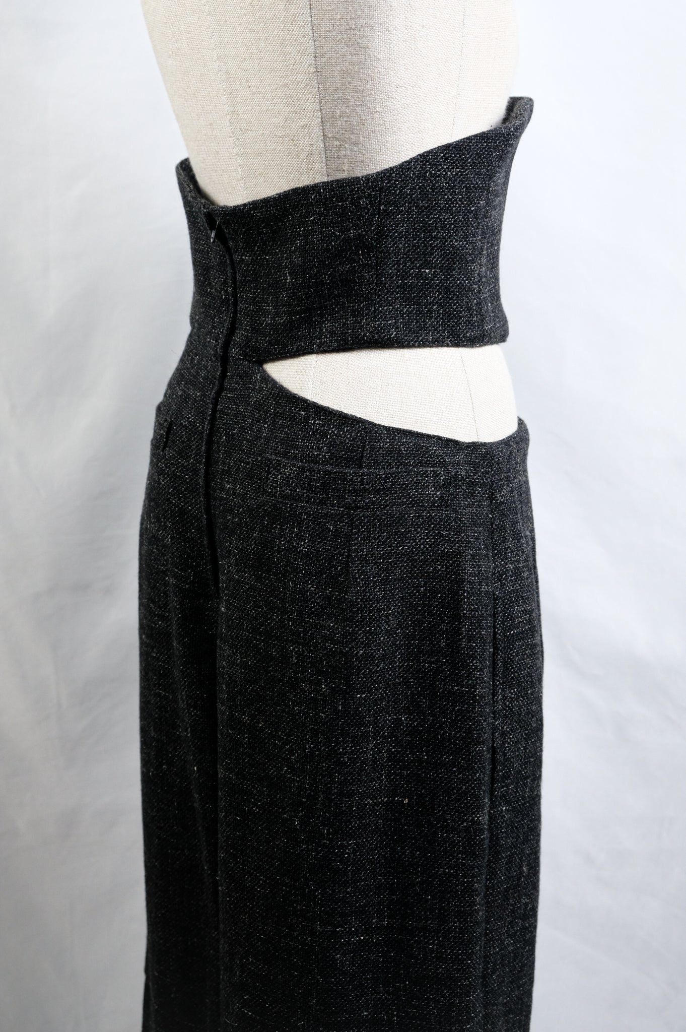 The length of the bustier is just long enough to cover the top of the bust, creating a sensual look, and the combination with the ascetic, intellectual wool material gives the wearer a sense of depth.