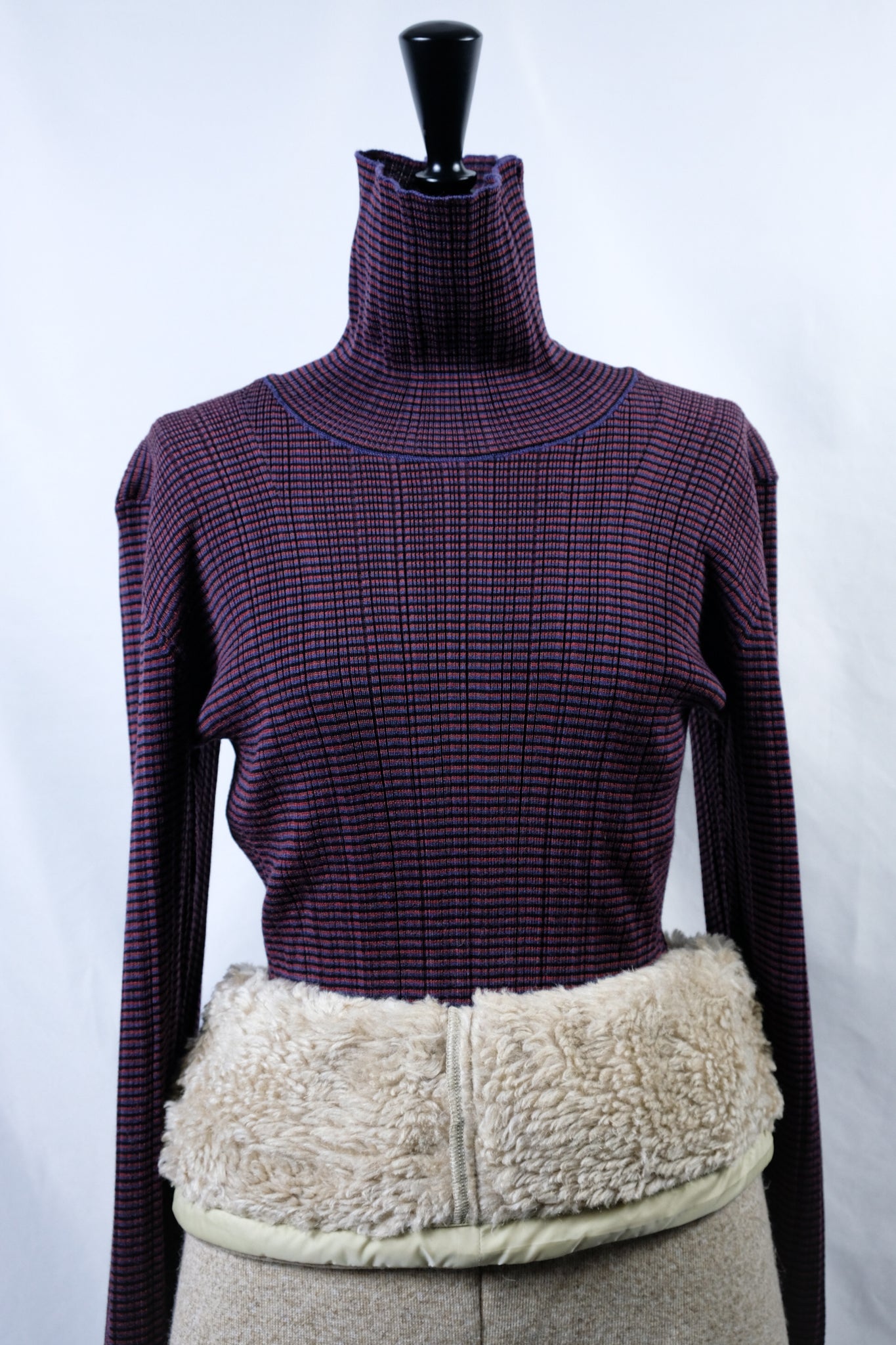 A high-neck sweater with a fine border and random rib pattern.