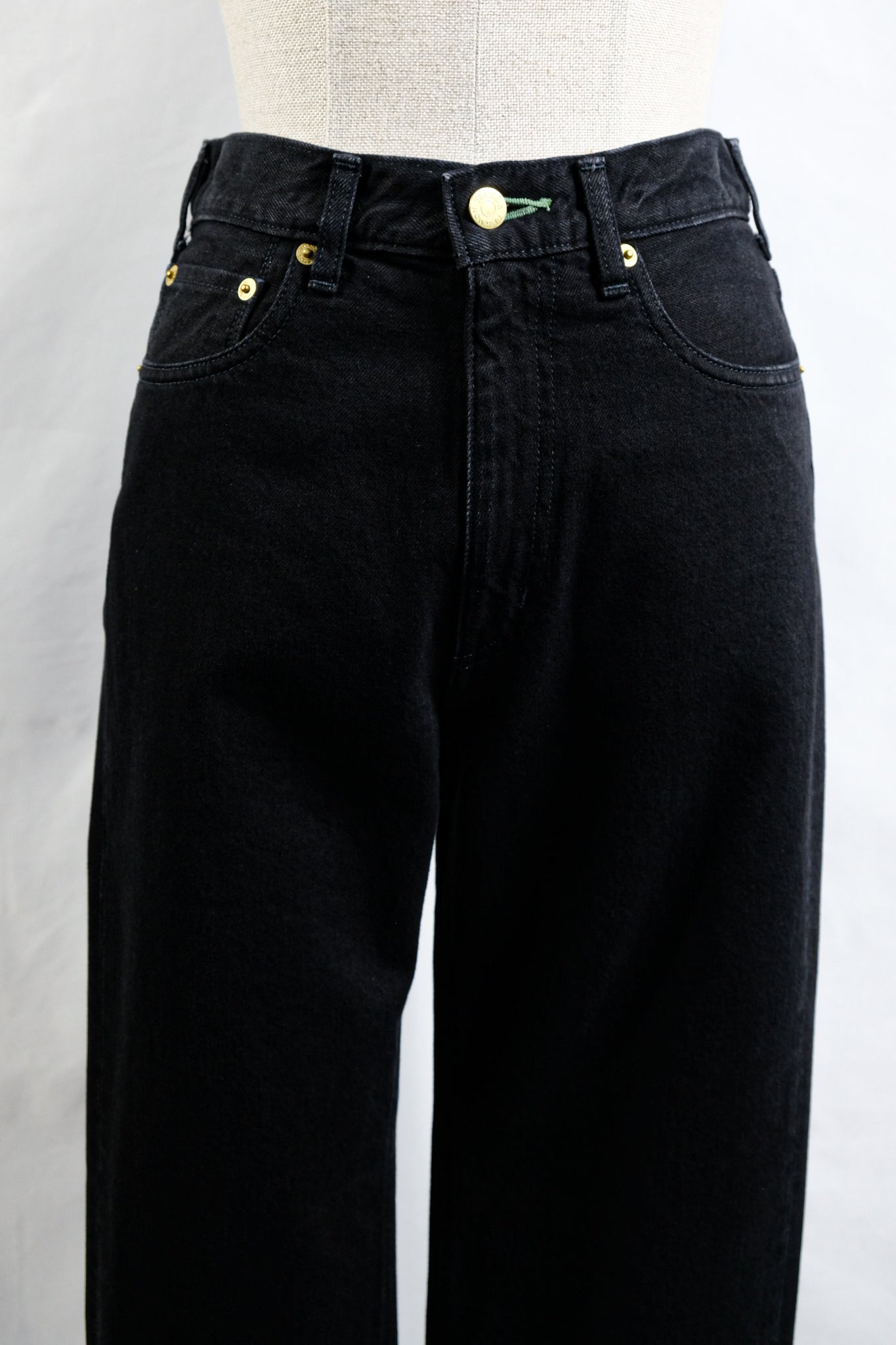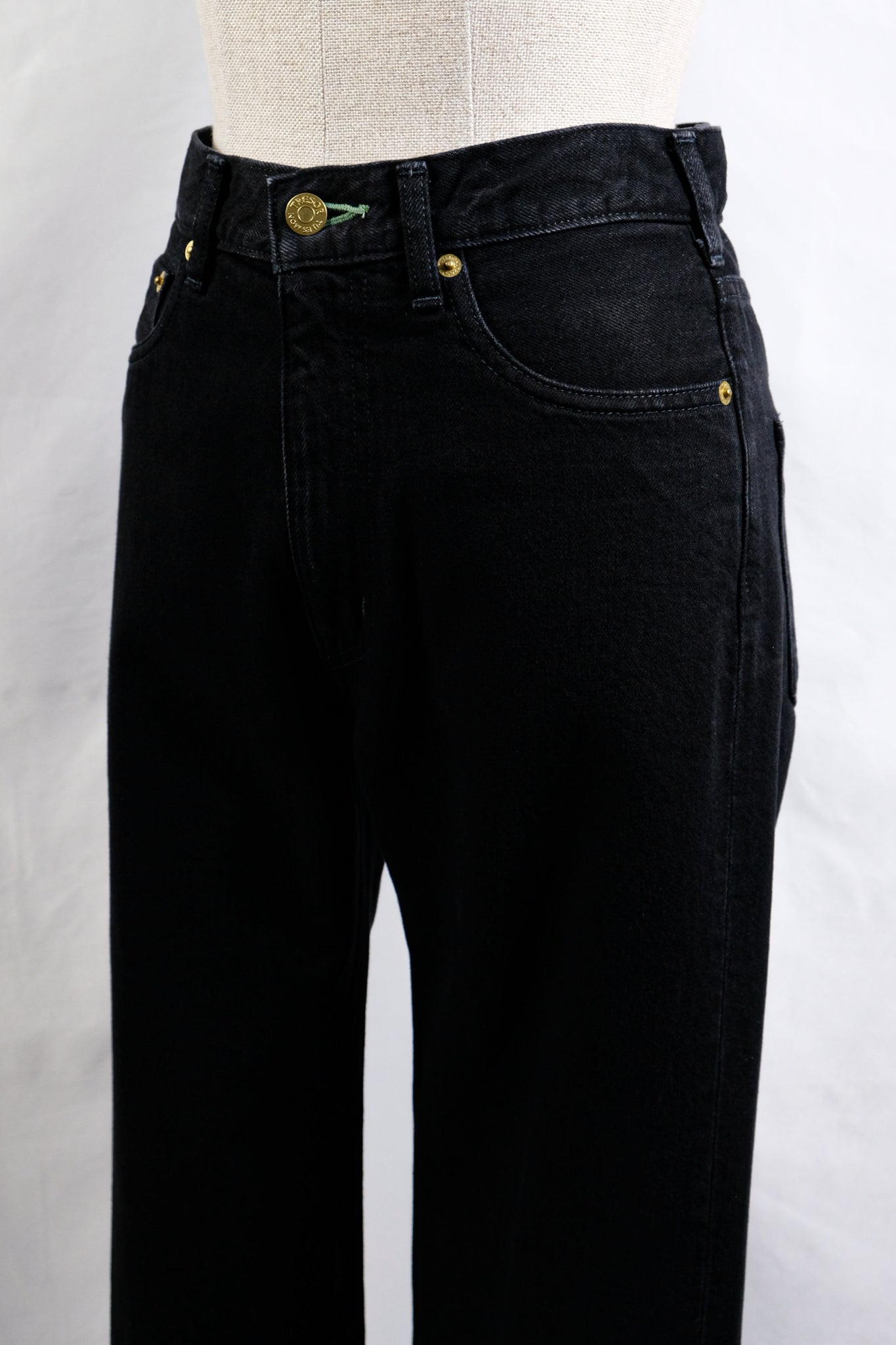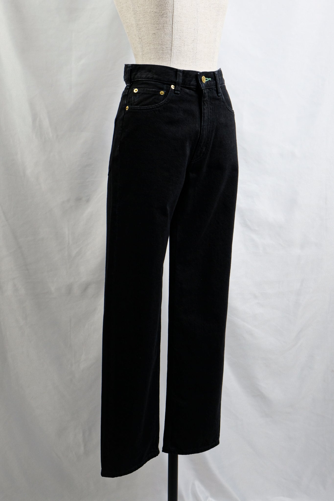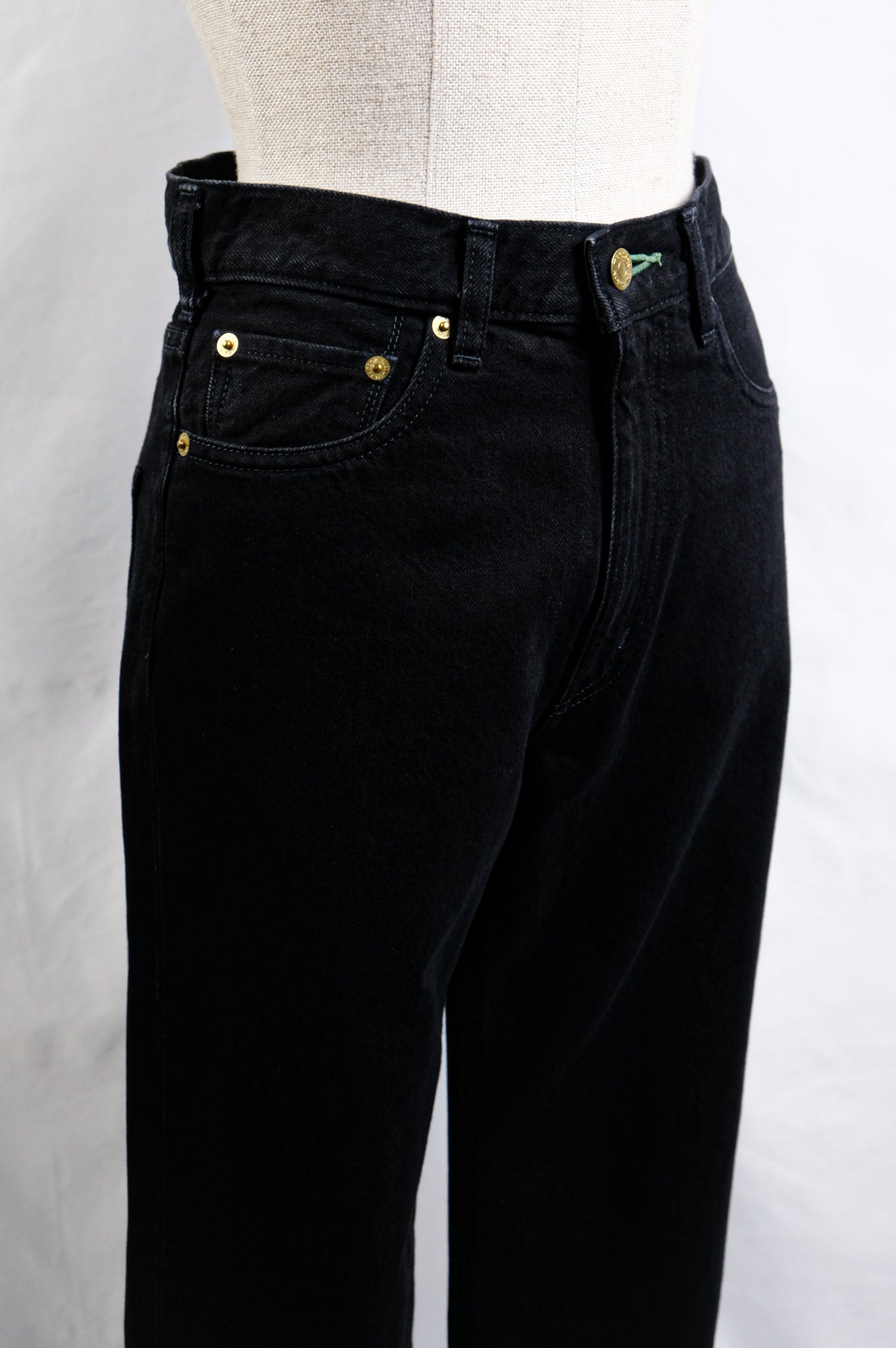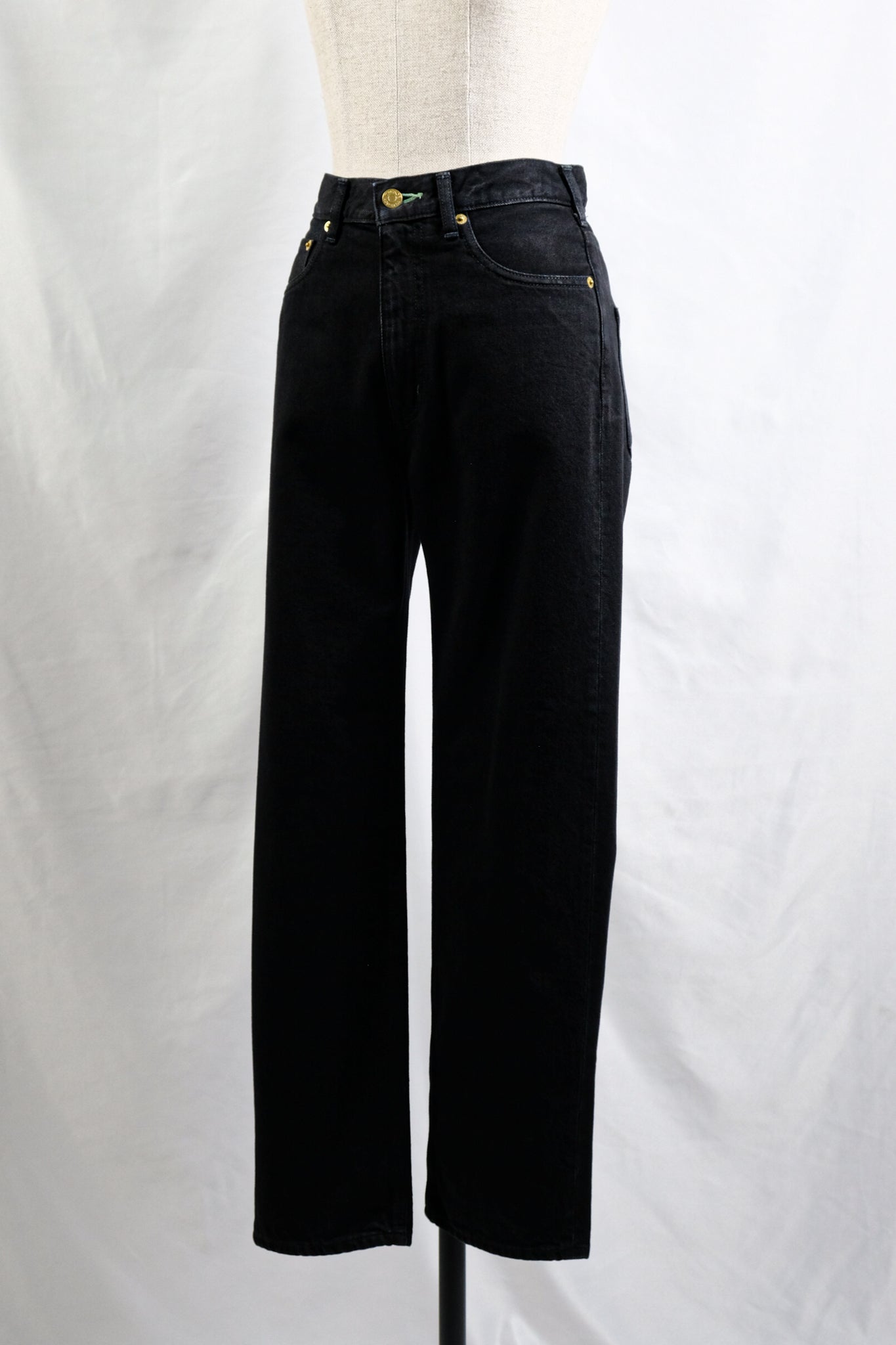 Each pair of jeans is individually handcrafted with signature gold-plated buttons and emerald green buttonhole stitching.