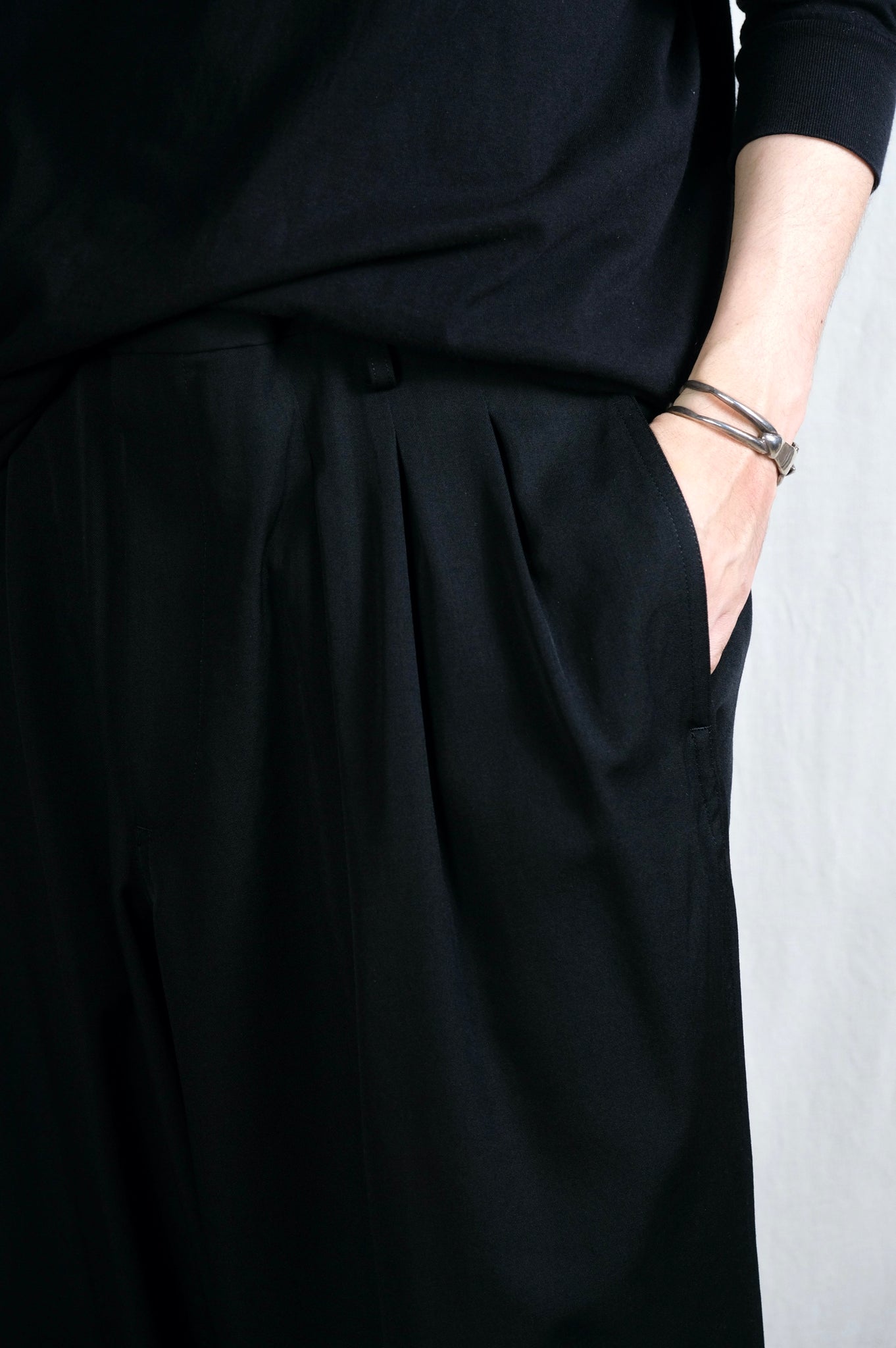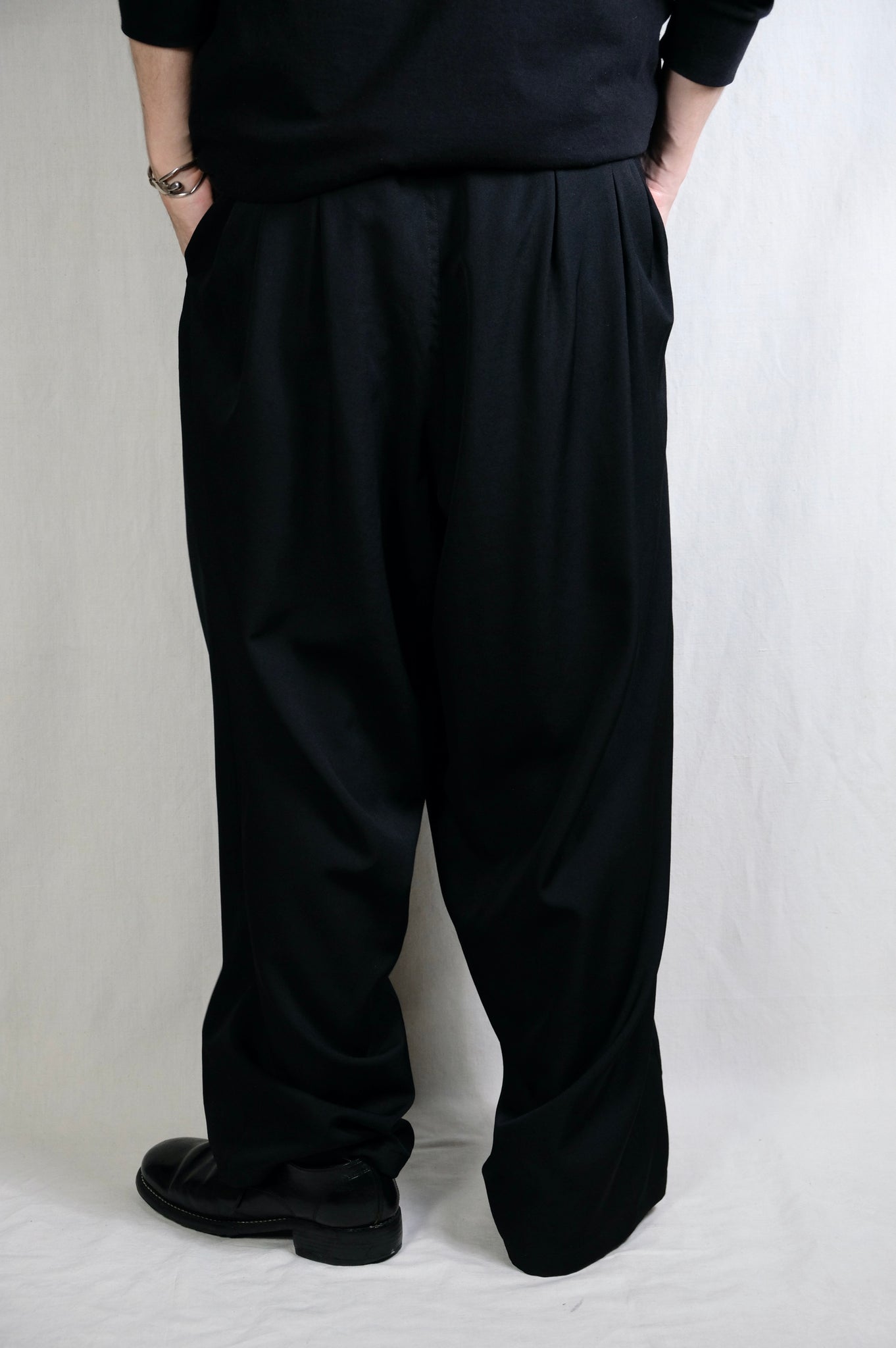 生地は、仕上げの工程でセット性を弱くすることにより織物に軽くシワやシボを付け、ウール本来の風合いに仕上げたヨウジヤマモト社の定番素材であるウールギャバジンを使用しています。タックを12本配したことによるたっぷりとしたゆとりのあるシルエットが特徴的です。