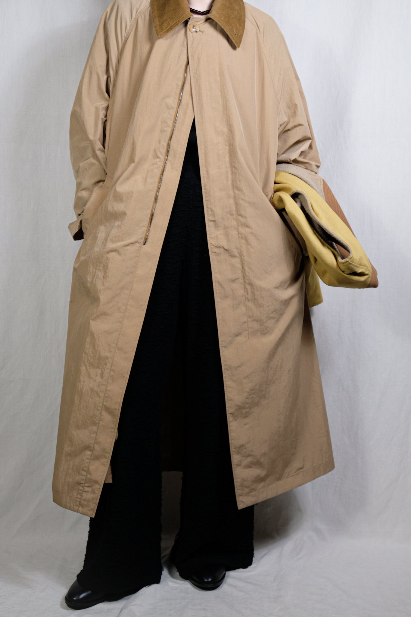コートはステンカラーデザインで襟がコーデュロイ素材に仕上げています。