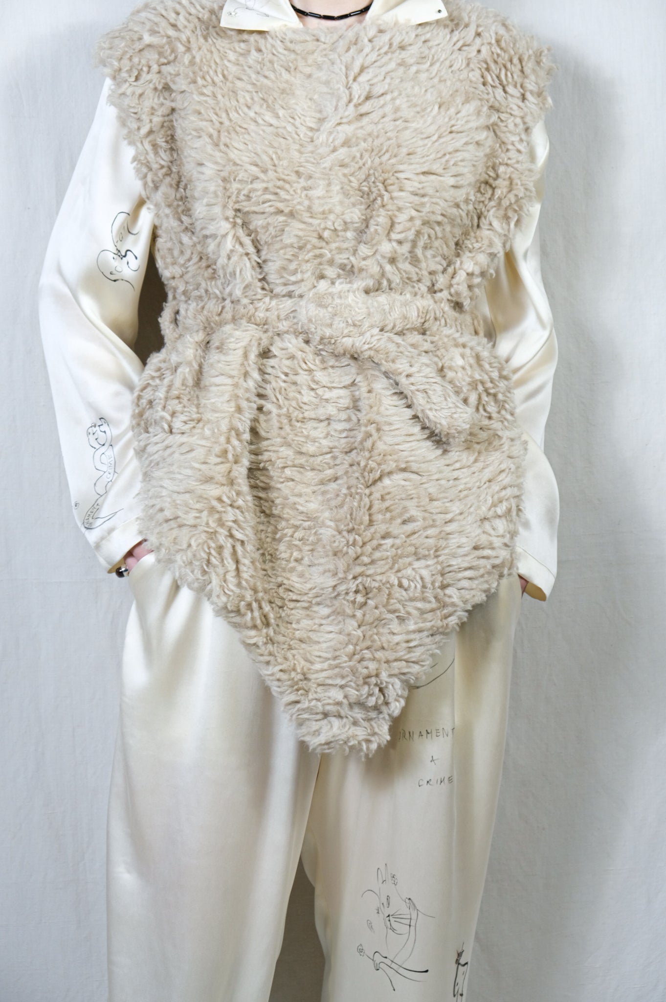 無染⾊ウール、⽣成リネンをブレンドした原料をパイルに使用したナチュラルで温かみのある色合いで、 保温性の⾼いボア素材を使⽤したコスチュームロンパース。