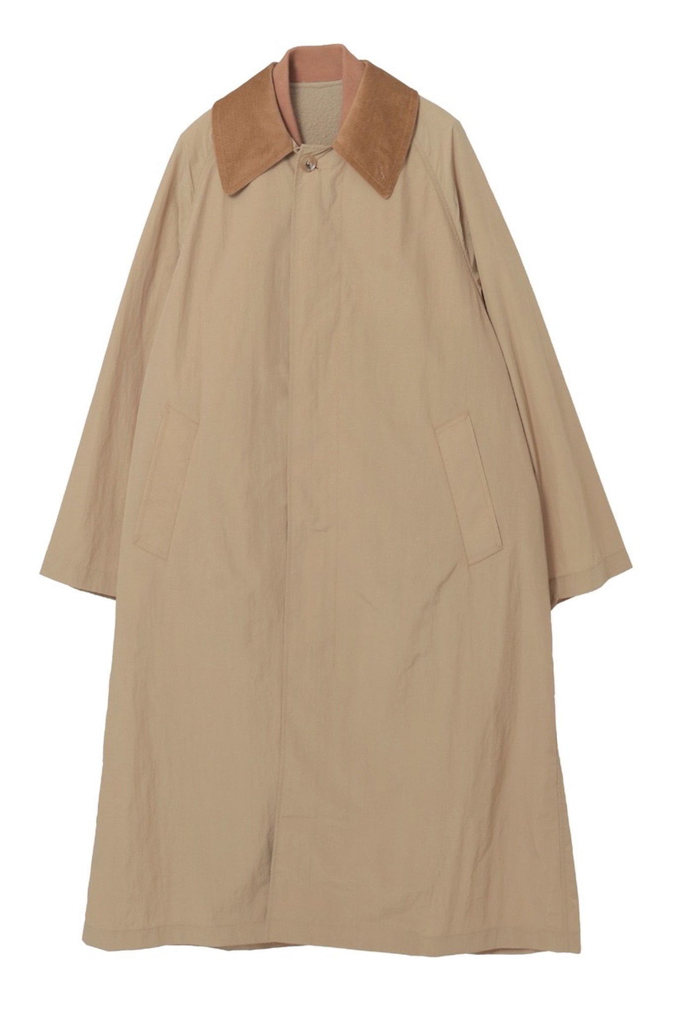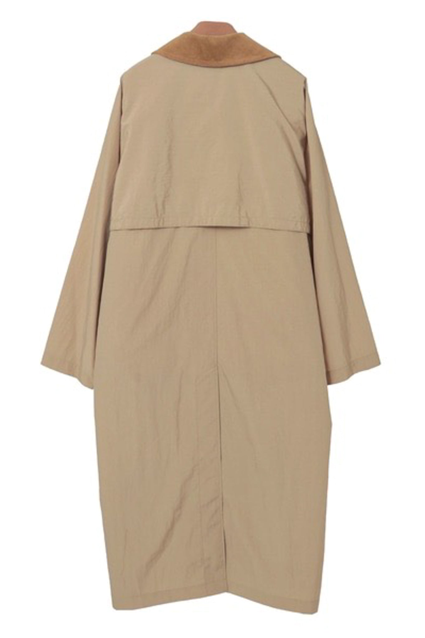 コートはステンカラーデザインで襟がコーデュロイ素材に仕上げています。